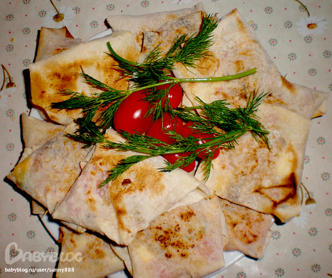 Каждый лаваш разрезать на 6 примерно одинаковых квадратов (главное чтобы они были целые, иначе начинка будет вытекать).