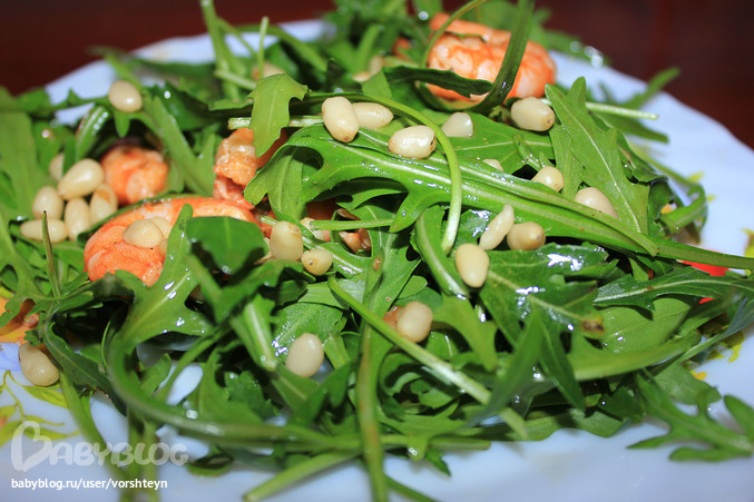Рукола + креветки, обжаренные в оливковом масле с чесноком + кедровые орешки