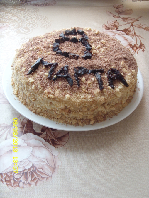 Раскатать и выпекать. Пока теплый врырезать корж какой нужен диаметр. Смазать кремом. Я посыпала еще мелко порезанным черносливом между коржами.Верх украсить крошкой и тертым шоколадом. ну и я сделала из чернослива надпись.