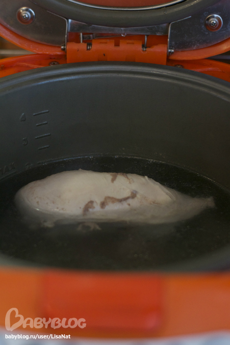 Когда овощи готовы, разбиваем их блендером, добавляем бульона до желаемой консистенции, режем курочку, зелень,