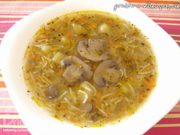 Так вот, приготовила я суп с шампиньонами. До чего же у него насыщенный грибной вкус и аромат, да еще подчеркнутый "грибными" пряностями.... Что там говорить, вкуснотаааа!
