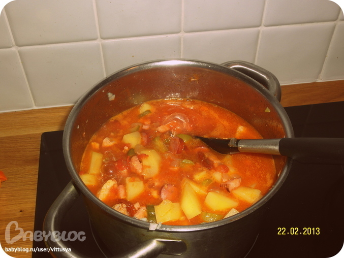 как и прописано в рецепте, начала я с обжарки своего мяска с грудинкой до румяной корочки, потом лучок с чесночком, потом огурчики и тушила мин 5. потом добавила помидоры из пачки и томаты вяленые (припаслась баночка)))) и тушила ещё минут 7. потом добавила картошку и колбаску и потушила ещё минут 5.