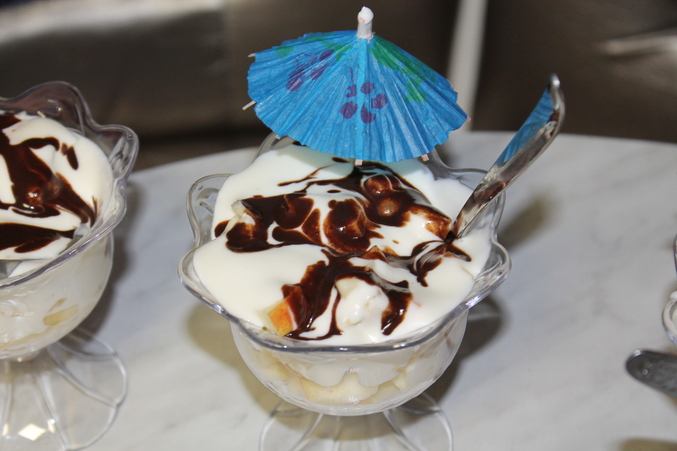 А ДЕСЕРТ - слоями - крем - фрукты - крем - фрукты - крем - шоколад. По желанию можно добавить печеньки рыбки. Тоже прикольно получается.