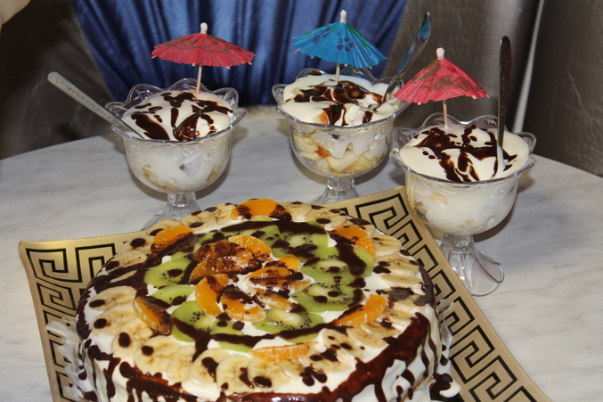 Купила в магазине коржи, фрукты, сметану и сахар взбить в блендере (долго взбивать до густоты). На корж крем, потом фрукты, потом корж, крем, фрукты. Сверху полила шоколадом, растопила в микроволновке (водяная банька, хи-хи)