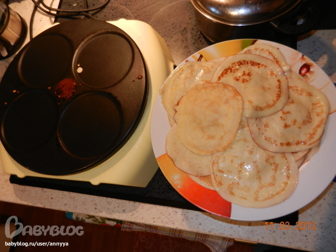 У меня тефаль, насадка на 6 маленьких или два больших блина. Я только на ней могу блины печь, на сковороде не получается. Да и по времени это очень быстро. Я теперь делаю блины с начинками, получаются тонкие, пекутся быстро.