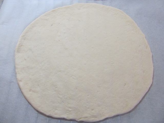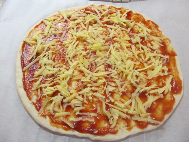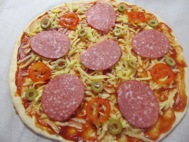 и разделить тесто на две части, можно делать две пиццы, а можно заморозить вторую половину для следующего раза