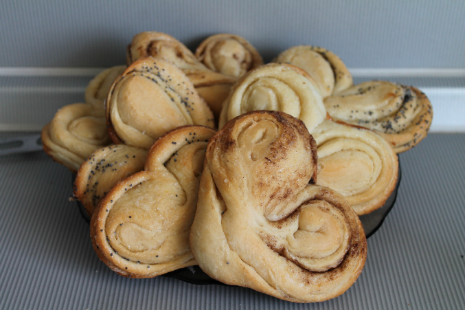 Постные блюда450гр муки,смешать с 100 гр сахара,0,5 ч.л.соли.Дрожжи (у меня были активные сухие дрожжи) растворить в теплой воде (на 5 гр пол стакана воды).Для улучшения активации добавить 1 ч ложку сахара.размешать и дать постоять 15 минут.После того как дрожжи поднялись,добавить в муку.замесить тесто,в конце добавить 50 гр маргарина(растопленного и охлажденного).Дать тесту подняться 2 раза.После сформировать шарики,раскатать каждый шарик,помазать маслом(у меня было оливковое),посыпать сахаром,корицей,маком,ванильным сахаром,вообщем по вкусу.сформировать рулетик,сложить пополам ,при помощи ножа сделать глубокий надрез на изгибе рулетика, не разрезая до конца 2 см и развернуть две получившиеся половинки рулетика сахарной стороной вверх (получается плюшка ).Выложить на противень с пергаментной бумагой,помазанной маслом.оставить на некоторое время для расстойки,после смазать гладкие стороны плюшек маслом или крепким сладким чаем.Выпекать 30 мин(может и 20 мин,зависит от духовки) при 180 гр.