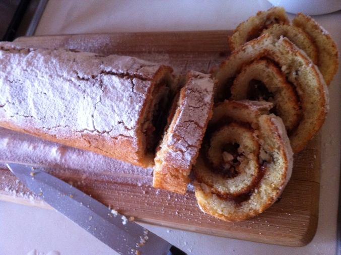 начинка- у меня была плитка шоколада на водяной бане растопила, мелко 1 банан нашинковала добавила в шоколад и на готовый остывший бисквит мазала, заворачивала и в пленку пещивую и в холодильник на часик чтоб впитовался. а потом наслаждались с чаем