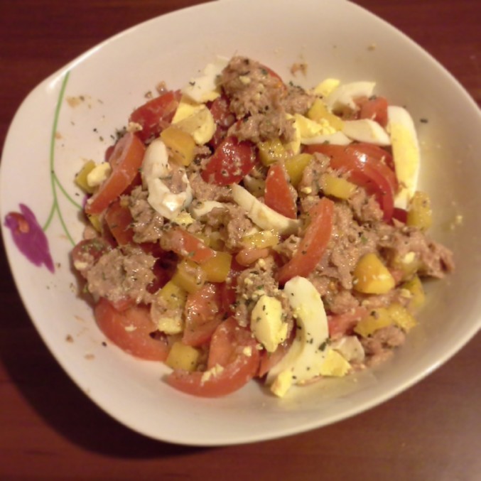 Салатыбанка тунца, 2 яйца, томаты, перец, посыпать базиликом, заправить оливковым маслом. Быстро, вкусно, полезно.