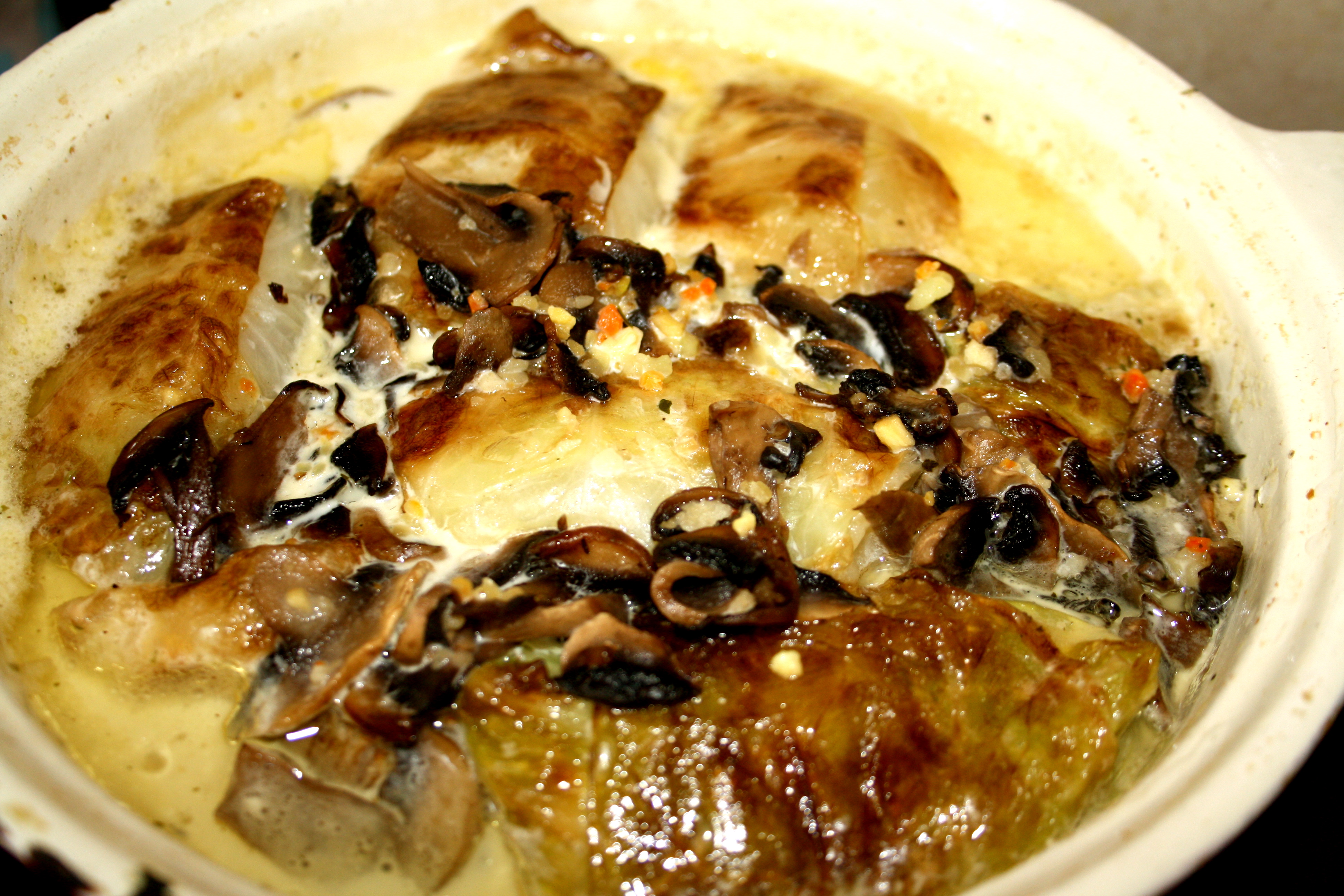 От капустного кочана аккуратно отделяем 12 шт капустных листьев, бросаем в кипящую подсоленную воду, блашируем 3-5 мин, вынимаем шумовкой, слегка отбиваем молоточком для мяса. Грибы с луком тонко режем, обжариваем на 1 ст.л. масла, подсаливаем. Картофель почистим, отварим, разомнем в пюре, тонкой струйкой вводим соевое молоко (1 ст.л. на полстакана горячей воды), добавим 2-3 ложки обжаренных с луком шампиньонов, замешаем - получиться начинка для наших голубцов. Откладываем 2 капусных листа, для чего - я скажу позже. Остальные 10 начиняем картошечкой и сворачиваем. Накаляем на сковородке 2 ст. л. растительного масла, обжариваем на нем голубцы с двух сторон до золотистой корочки. На дно чугунного казана наливаем немного масла. Кладем на дно 2 отложенных капустных листа, свеху на них выкладываем обжаренные голубцы. Готовим заливку: на 1,5 стакана кипятка добавляем соли (или готовых преправ, я брала вегету) по вкусу, осторожно, по ложечке добавляем майонез, взбивая заливку венчиком, и оставшиеся грибы. Заливку отправляем к голубцам, сверху накрываем обычной плоской тарелкой прямо поверх голубцов и крышкой. Томим на тихом огне 20 минут, можно подать с зеленью, овощами и рисом. Приятного аппетита!