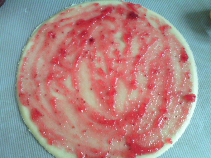 Берем кусок теста и раскатываем достаточно тонкий круг. Ровно раскатывать я не умею, поэтому вырезала круг большой суповой тарелкой. Смазываем тонким слоем варенья или джема.
