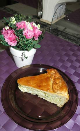 Раскатать один пласт теста чуть больше, чем размер формы. Перенести тесто в смазанную маслом форму. Выложить на тесто начинку. Накрыть вторым пластом теста, края хорошенько соединить. Смазать поверхность теста яйцом, поставить в разогретую до 180 градусов духовку и запекать до готовности в течение 30-45 минут. Если при выпекании верхний слой теста вздуется, проткнуть зубочисткой. Готовый пирог вытащить из духовки, остудить, нарезать на порционные куски и подать к столу. Приятного аппетита!