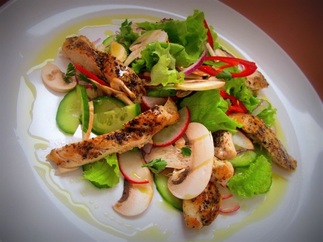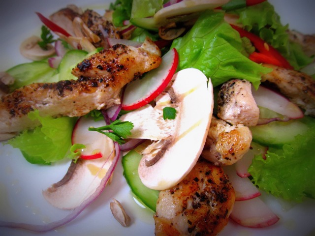 Острый овощной салат с нежным куриным филе в перечной панировке
