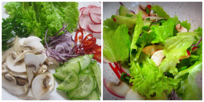 Овощи нарезать тонкими ломтиками, салат порвать на кусочки , перемешать всё это буйство вкуса и выложить на тарелку.