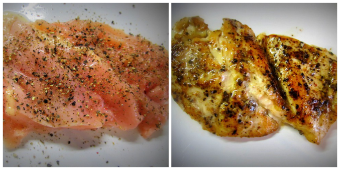 Куриное филе обильно приправить свежемолотым перцем,( у меня гремучая смесь из чёрного, чили, белого, розового и душистого перца) солью и обжарить на сковороде. Курица будет остренькая, но так и задумано)))))