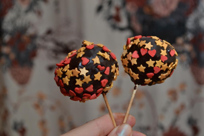Печенье с сахаром размять, блендером в крошку перетереть. Добавить мягкий творог и какао. Слепить шарики, обвалять их в посыпках и воткнуть палочки:)))