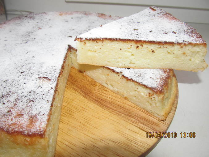 Сверху лопаткой я сделала незамысловатый узорчик, как в последствии оказалось зря! Чтобы вытащить запеканку из формы ее пришлось перевернуть, и вся красота оказалась снизу. Но ничего, верх "задекорировала" сахарной пудрой.