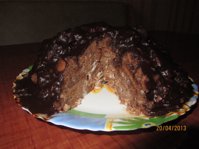 Достаем большую красивую тарелку и начинаем формировать тортик.Отламываем небольшие кусочки бисквита,макаем в сметанный крем и выкладываем на блюдо горкой.Бисквит должен быть остывшим.Сверху заливаем глазурью и в холодильник а 2 часа чтобы все хорошенько пропиталось.