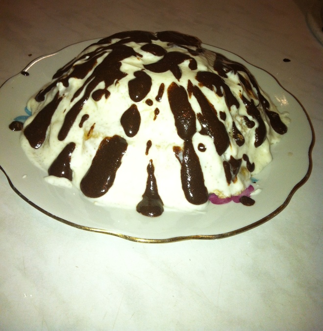 Так. Бисквит: 3 яйца и 2 ст.сахара, смешиваем, + 1/2 л кефира и 100 мл раст.масла, смешиваем, + 2 ч.л. соды и 3,5 стакана муки, смешиваем, выливаем в большую форму и в духовку. Смотри, форму бери подольше, у меня где-то 20х30 см, он еще же и поднимается хорошо. Пока печется, делаю крем: 2 банки сметаны (это 0,9 кг) и 2 ст.сахара смешиваем и даем немного настояться. Наш бисквит режем вдоль и я обычно прикладываю большую тарелку и по ней выражаю круглую основу, она где-то 1,5-2 см толщиной должна быть. Основу кладу на тарелку, намазываю кремом, а все, что осталось, нарезаю кубиками 2*2 см примерно и каждый обмакиваю в крем, а потом укладываю на основу, формируя горку. Внутрь, естественно, ананас или чего там душа пожелает, а сверху поливаю глазурью шоколадной: 1/3 стакана какао и 2/3 стакана сахара развожу 3-4 ст.л. воды. Теперь то, что получилось, в пищевую пленку и на сутки в холодильник, чтобы пропиталось