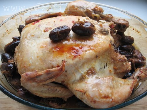 Затем уложить птицу в огнеупорную форму, насыпать вокруг нее финики, укрыть фольгой и запекать в духовке 2 часа. Можно сначала положить курицу в форму грудкой, а потом перевернуть на спинку. За 15 минут до готовности курицу раскрыть, слить лишний жир и дать подрумяниться.
