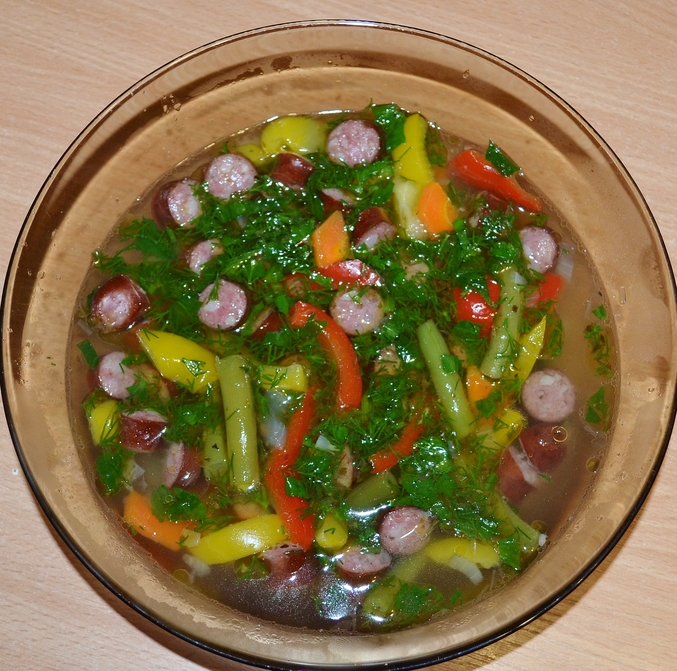 ИНГРЕДИЕНТЫ: ОХОТНИЧЬИ КОЛБАСКИ (МОЖНО ЗАМЕНИТЬ ОДЕССКОЙ КОЛБАСОЙ) СТРУЧКОВАЯ ФАСОЛЬ,МОРКОВЬ,ПЕРЕЦ БОЛГАРСКИЙ ЖЕЛТЫЙ,КРАСНЫЙ,ЧЕСНОК,КОРЕНЬ СЕЛЬДЕРЕЯ,ЗЕЛЕНЬ ПО ВКУСУ,ЧЕБРЕЦ,МАЙОРАН,ЛУК.