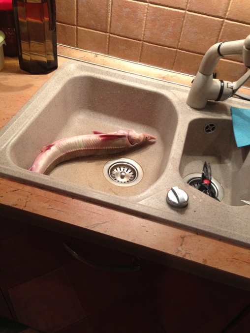 Принес муж стерлядь домой...много стерляди...очень много...пришлось полочку в морозилке вынуть, чтоб все убрать...одна шт не поместилась, и на ночь глядя, поискав на просторах Инета все возможные варианты рецептов, осуществила определенный микс!
