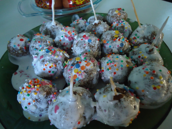 а дальше сплошная непруха пошла. Крем я решила заварной шоколадный сделать из пакетика вестимо, так я не очень кулинар. Молока перелила, масла не доложила, но в целом терпимо. С палочками решила быстро - накатаю маленьких и на зубочистки. Стала топить молочный шоколад, мало показалось, совершила я тут видимо роковую ошибку, добавила плитку "российского" горького, весь мой мягкий шоколад тут же в камень превратился. Зубочистки плохо закрепились и окунать уже некуда, ну и пусть, Пасха же скоро.Взобью=ка я белковую глазурь и будут у меня, типа куличики - нет не будут, сказал блендер, и плохо взбил, белок с сахарной пудрой. Теперь эта липкая несохнущая субстанция с посыпкой декоративной ждёт своей судьбы незавидной........Хотя сами шарики очень вкусны.