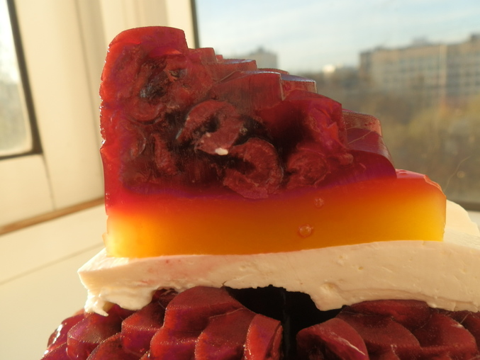 Рецепт:Приготовить желе( вишневый компот,примерно 400 мл+2 пакетика желатина.В 100 мл компота растворить желатин и добавить в основную массу жидкости с ягодами) -дать слегка застыть в форме.Выжать сок из апельсинов(тоже примерно 400 мл),приготовить желе.Влить на вишневую заготовку и в холод на 2 часа..Взбить блендором 1 пачку 9% творога,500 гр сметаны(жирность по вкусу),100 гр сахара и пакетик(5 гр) ванилина.Растворить пакетик желатина в 50-100 мл воды и вылить в творожную смесь.На окрепшее желе добавить творожную смесь и поставить на ночь в холодильник