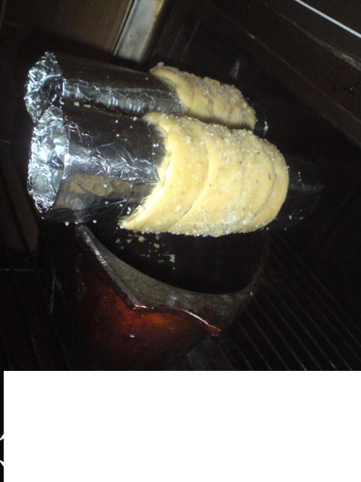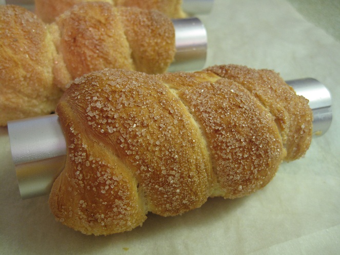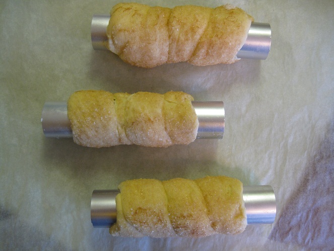 Слегка остужаем (только слегка) и снимаем трдло с алюминиевой трубочки. Щедро посыпаем еще горячее трдло нашей смесью (сахар, ванильный сахар, корица).