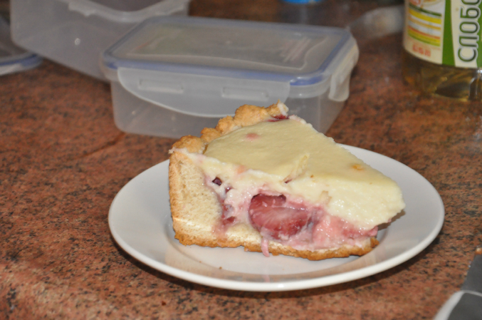 Размягченное масло взбиваем с сахаром. Добавляем сметану и еще раз взбиваем. Добавляем мучную смесь и замешиваем тесто.Равномерно распределяем его по дну и бортикам разъемной формы.На дно укладываем клубнику.Готовим заливку. Для этого слегка взбиваем сметану с сахаром, яйцом и мукой.Выпекаем пирог в течение 40-50 минут в духовке при температуре 180 градусов до загустения заливки и образования на ней золотистой корочки. Пирог охлаждаем, разрезаем и подаем к чаю или кофе.