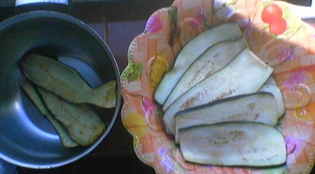 Режим баклажан вдоль, пластинами толщиной 0.7 см, солим и оставляем, чтоб ушла горечь.Затем обжариваем с обеих сторон и складываем в кастрюльку под крышку, что б стали мягкими