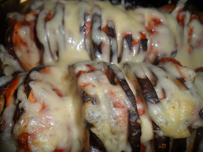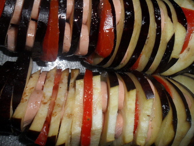 Баклажаны (перед приготовлением их можно замочить в соленой воде на 10 минут, чтобы убрать возможную горечь), помидор, сосиски порезать кружочками и соорудить нехитрую конструкцию, чередуя ингридиенты. Всё поместить в форму, смазанную растительным маслом. Посолить.