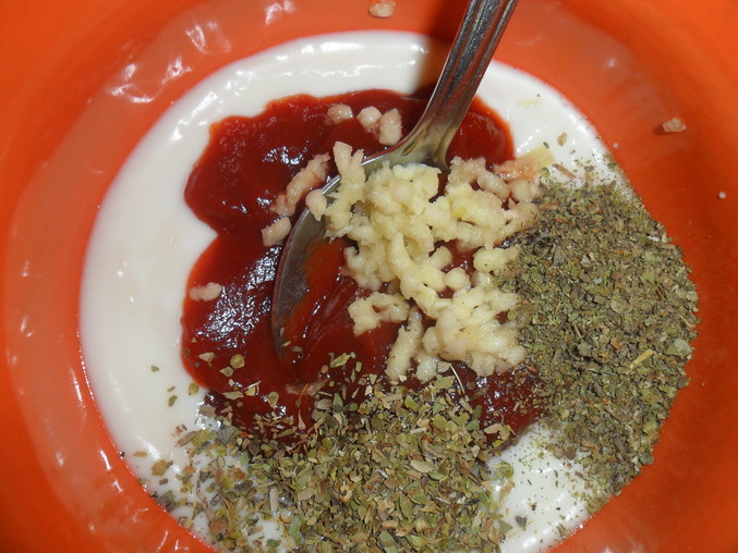 в мисочке смешиваем натуральный йогурт, томатную пасту (можно мякоть помидор, но у меня, как вы знаете, с этим была напряженка), чеснок, соль, майоран и орегано.
