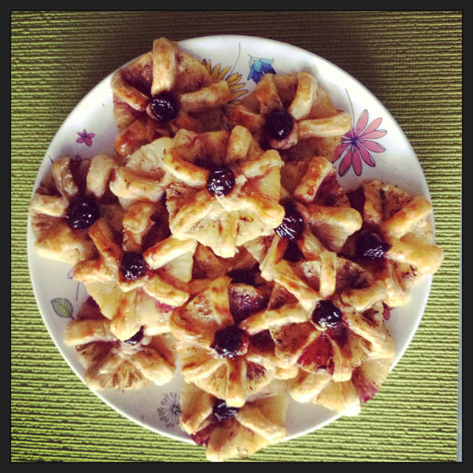 Значит так,открываем ананасы и выкладываем их на салфетки,пусть немного обсохнут,минут 10 не больше,пока ананасы соннут,режем тесто на полосочки,шириной 1 см.Готовое тесто можно не раскатывать,у меня оно итак тонкое было.Посыпаем ананасы сахарной пудрой,корицей.Далее через середину продеваем тесто по кругу.В серединку можно положить любую ягодку для красоты,у меня это вишя из варенья.Смазываем взбитым яйцом и кладем на бумагу для выпечки,можно просто на протвень,но тогда смазанный маслом.И в духовку на 30 мин при температуре 200гр.И еще один момент,может пригодится.Я некоторые ананасы обмакивала,а не смазывала яйцом,так вот те,которые обмакивала,прилипли к бумаге,трудно было отодрать...так что смазывайте специальной кисточкой!