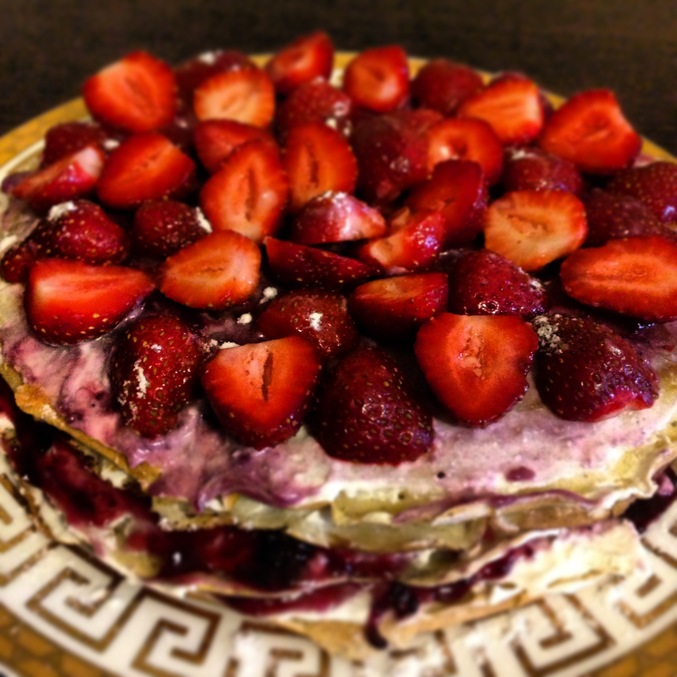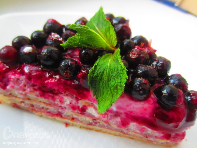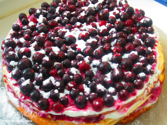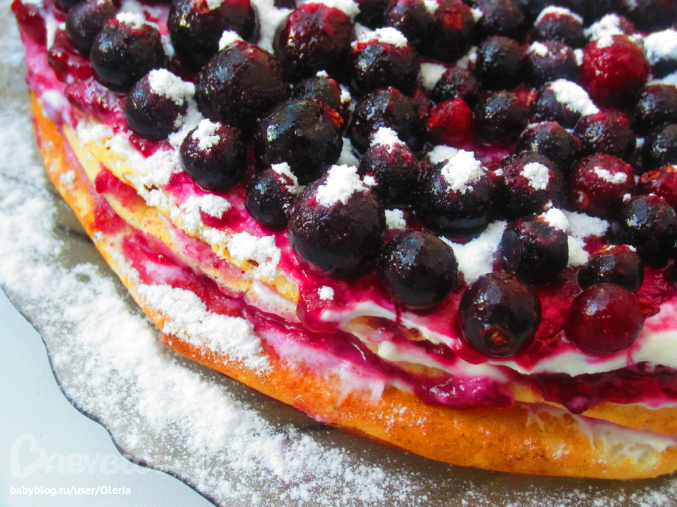 Выпекли один корж и сразу намазали творожным кремом, а затем сверху ягодным конфитюром и так все 4 слоя. Сверху украсили ягодами! Можно есть сразу и не ждать пропитки! А можно и подождать)))