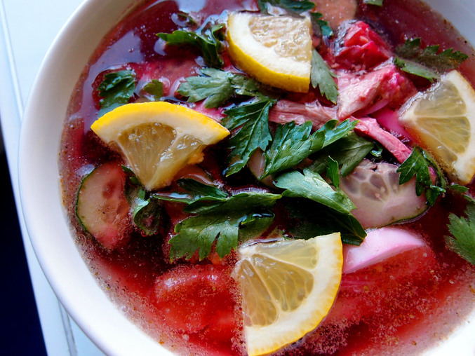 В тарелочки выкладываем основу для свекольника, заливаем бульоном, посыпаем рубленной петрушкой и украшаем ломтиками лимона. При желании можно добавить сметану или майонез, но я не добавляла, ибо не люблю )) Подавала комнатной температуры) Мне так вкуснее))