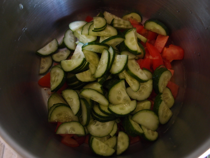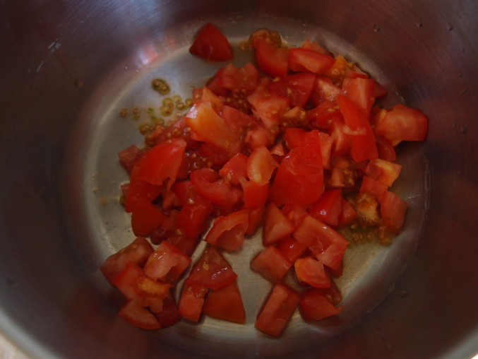 Помидоры режем небольшими дольками и складываем в кастрюлю.