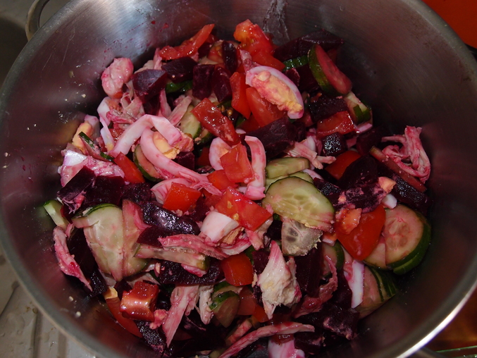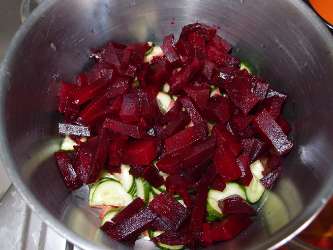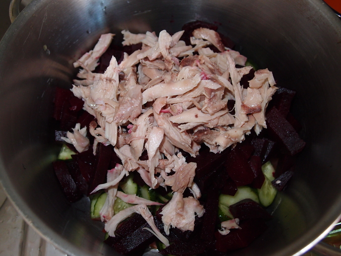 Теперь готовим бульон. Берем куриный бульон, свекольный отвар и минеральную воду в частях 1,5:1,5:1. Куриный бульон перед этим процеживаем. В бульон добавляем соль, перец и соевый соус. Количество добавок регулирем на свой вкус))