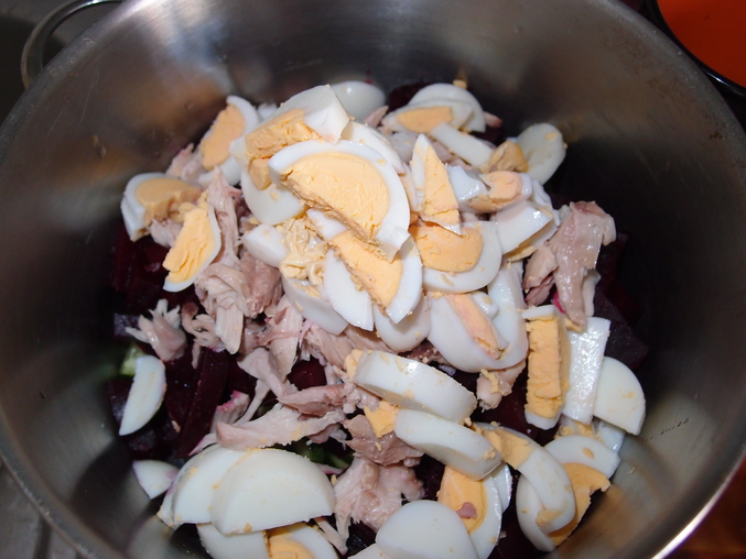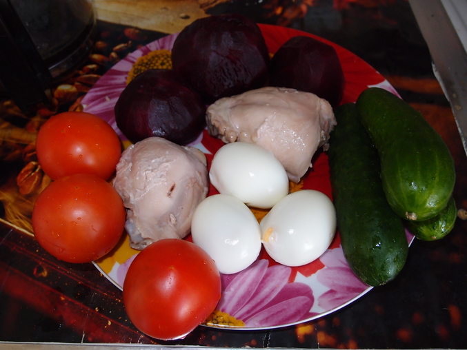 Варим куриные бедрышки. Бульон не выливаем - он нам пригодится. Варим свеклу. Бульон также не выливаем. Варим яйца. Всем вареным ингредиентам даем немного остыть.