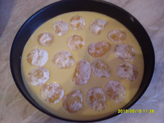 Пирог получается красивее и вкуснее если фрукты лежат сплошным слоем, но у меня дети сьели часть персиков и получилось так:) Далее форму поставить в духовку на 180гр., выпекать около 1часа. Готовый пирог посыпать сах. пудрой. Приятного аппетита.