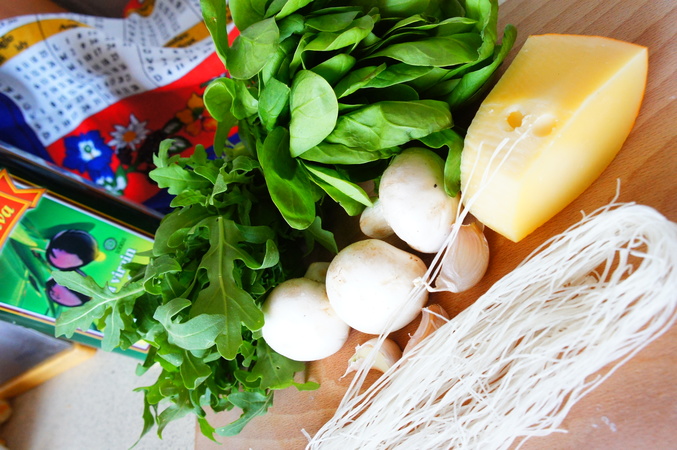 Нужно: рисовая вермишель или лапша, шампиньоны, шпинат, чеснок, оливковое масло, мягкий нежирный сыр, твердый сыр для посыпки, любимая зелень по желанию. Пишу без пропорций, поскольку делала все на глазок и если есть желание чего-то добавить или убавить, то делаете это на свой вкус.