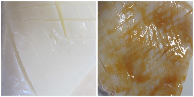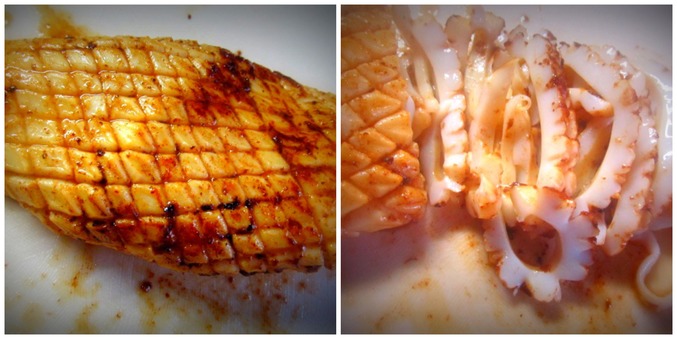 Сначала замаринуем кальмара. Надрежем филе крест накрест с одной стороны, для того чтобы маринад пропитался получше, ну и для красоты))