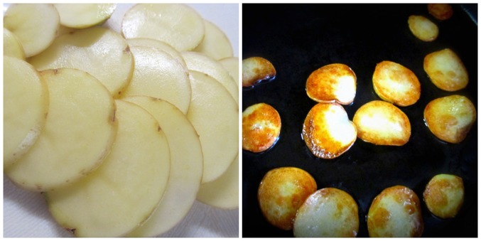 Молодой картофель, не очищая нарезать тонкими пластинками и обжарить. Выложить на салфетку и посолить.