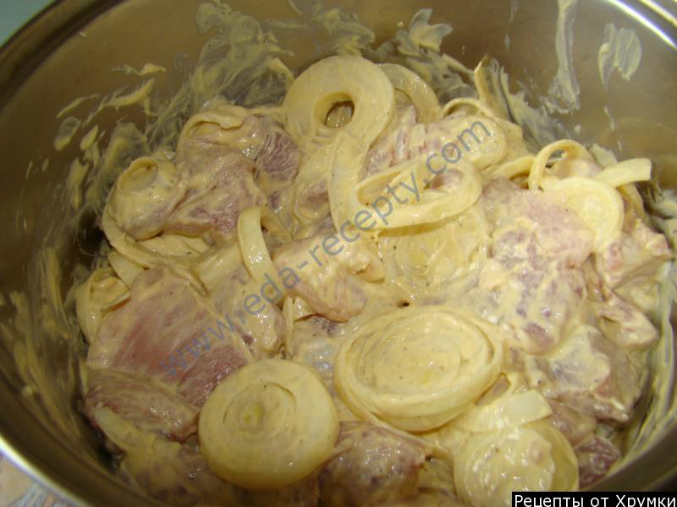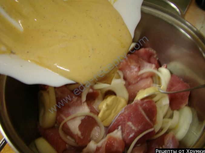 свинина —2 кг.майонез —200 гр.лук репчатый —3 шт.горчица —200 гр.соль, перец — по вкусу. Приятного аппетита !