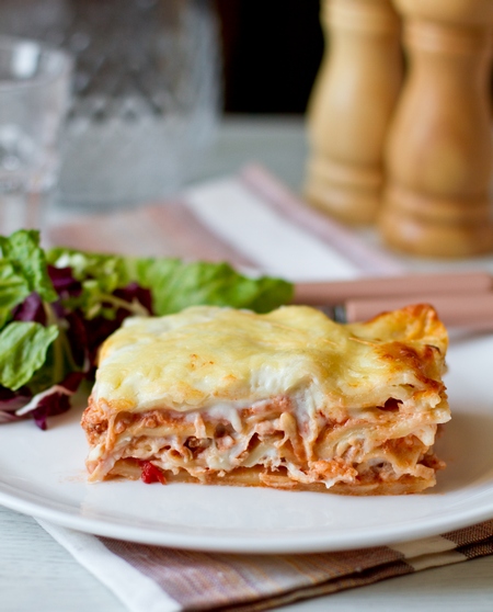 Сверху смазываем соусом бешамель. Поторяем дважды. Последний слой сыра накрываем листами для лазаньи, заливаем остатками соуса бешамель и густо посыпаем тертым пармезаном. Запекаем в разогретой до 200 градусов духовке в течение 35-40 минут.