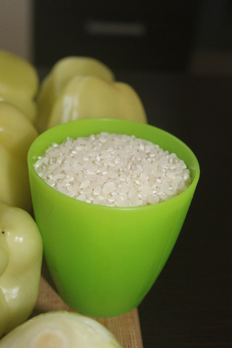 Сварить рис до полуготовности и промыть холодной водой. Дать ему стечь, рис должен хорошо подсохнуть. Поэтому лучше его сварить всамую первую очередь, еще перед перцами.