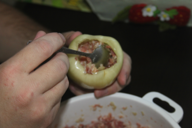 5. Подходим к финишу, начинаем заполнять перчики фаршем и укладывать на свои места.