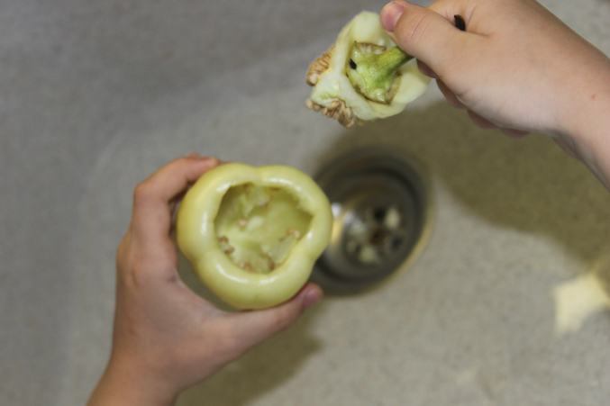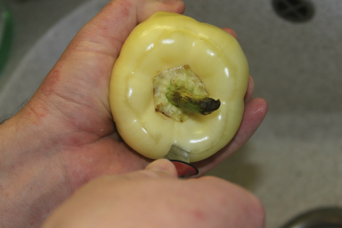 1. Подготовим перцы. Помоем, вырежим по-кругу плодоножку и освободим внутренность от семян. Пустые перцы, советую, сразу укладывать в чашу мультиварки (пустотой кверху), очень плотно, это поможет понять сколько перцев вам понадобиться. У нас уместилось 9 перцев.