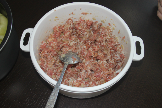 4. Займемся фаршем. Добавим в него соль, перец измельченный, тщательно размешаем. У нас в этот раз фарш был покупной, тк мясорубка в ремонте, я немного переживала, думала, что вкус изменится, но получилось также вкусно. Затем добавляем рис, обжареный лук и яйцо все перемешиваем. Хорошо бы фаршу немного настоятся, минут 15-20. Насытится, так сказать.
