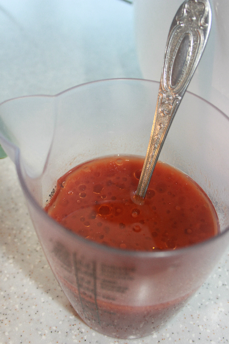 7. В отдельном стакане разводим томатную пасту с водой. Если фарш нежирный можно добавить немного растительного масла. Готовый соус добавляем к перчикам.